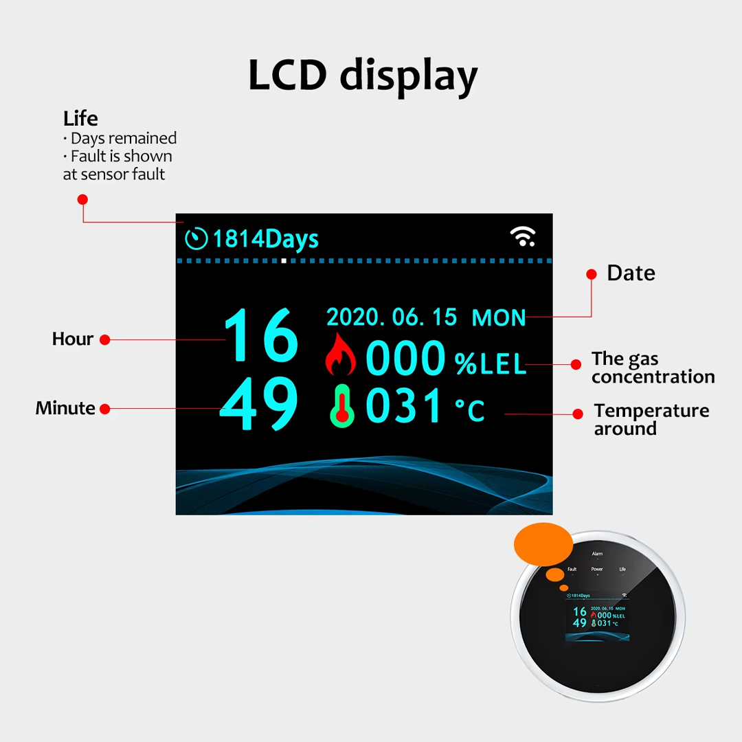 The Ledgebit Wi‑Fi Gas Leak Detector with LCD Display helps keep your home or office safe by checking for gas leaks and monitoring room temperature. It connects to 2.4 GHz Wi‑Fi and works with the Smart Life or Tuya App—no extra hub needed. The LCD screen clearly shows gas levels and temperature in real time.