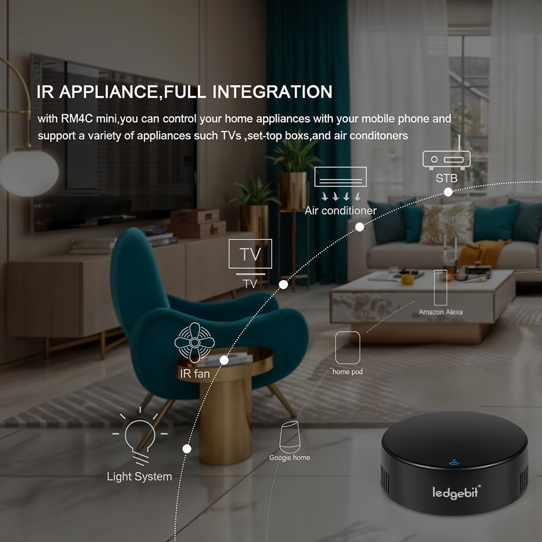 The Ledgebit Smart Wi‑Fi IR Remote Controller lets you take full control of your home appliances from one small device. It works as a universal remote hub, sending IR (infrared) signals to TVs, air conditioners, fans, media boxes, and more—all from your smartphone.