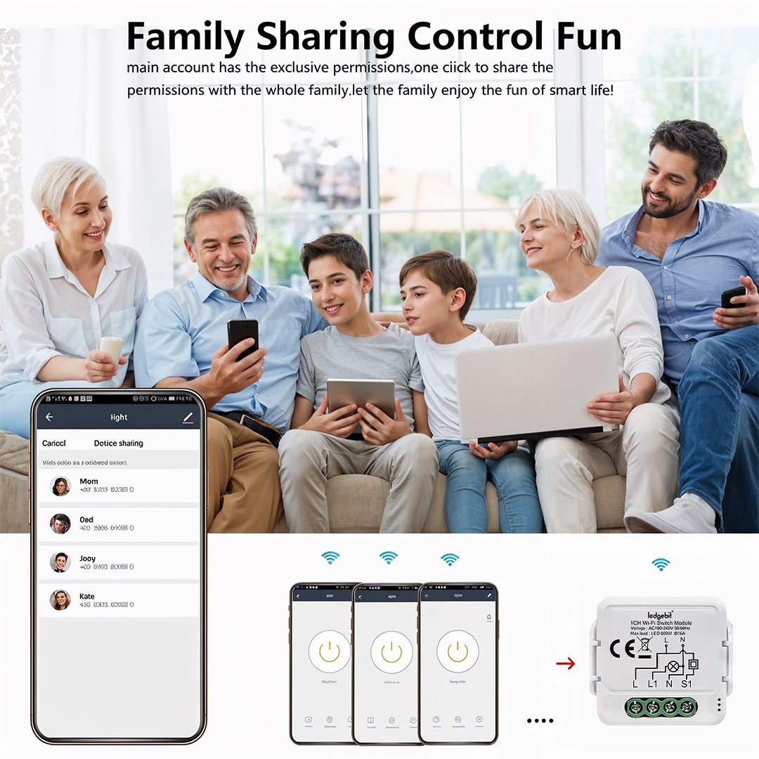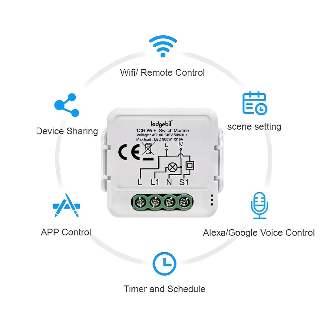 The Ledgebit Wi-Fi Smart Breaker One-Gang Module is a small but powerful device that lets you control up to four electrical circuits from your phone. Each channel supports up to 10A, making it perfect for lights, fans, or small appliances in your home or office.
