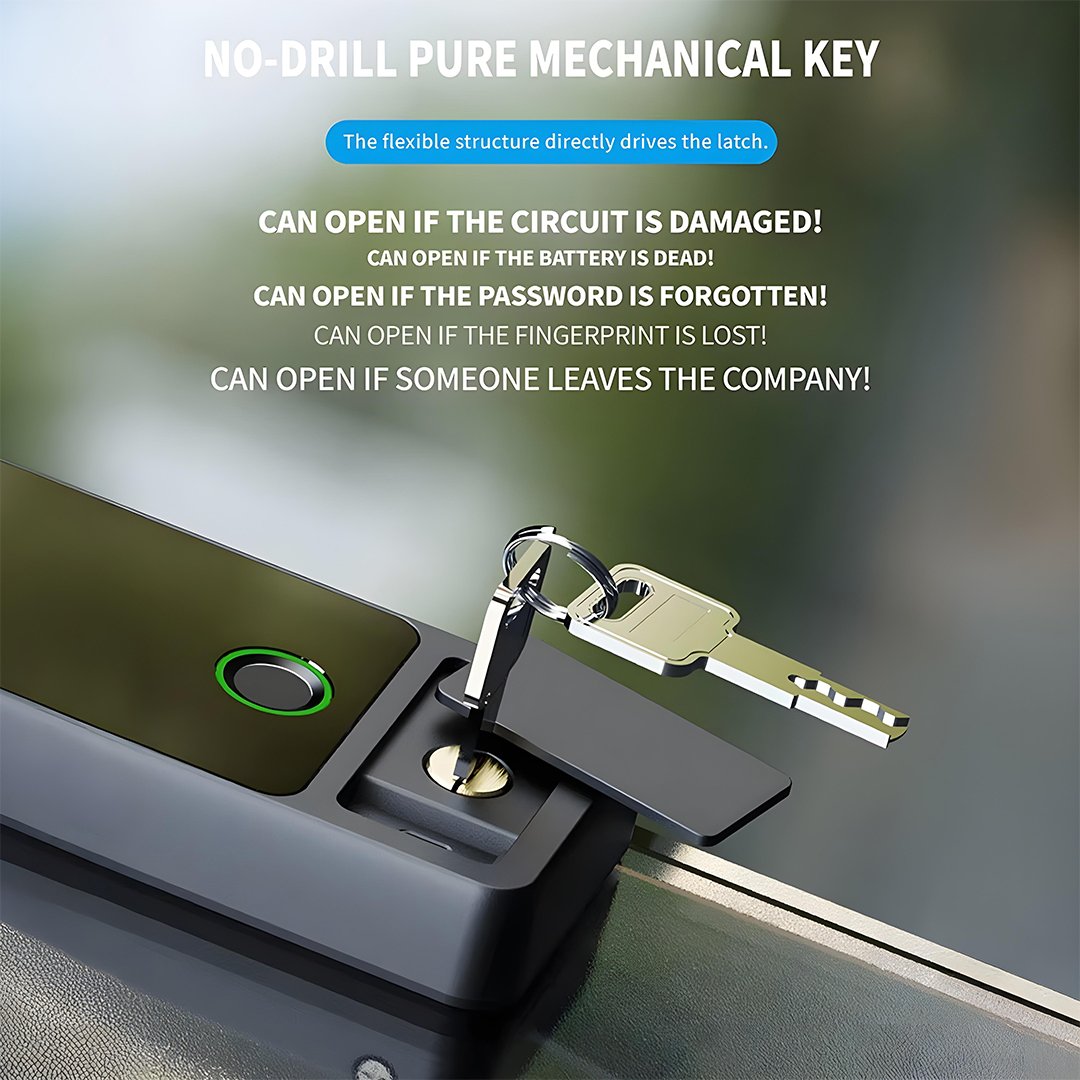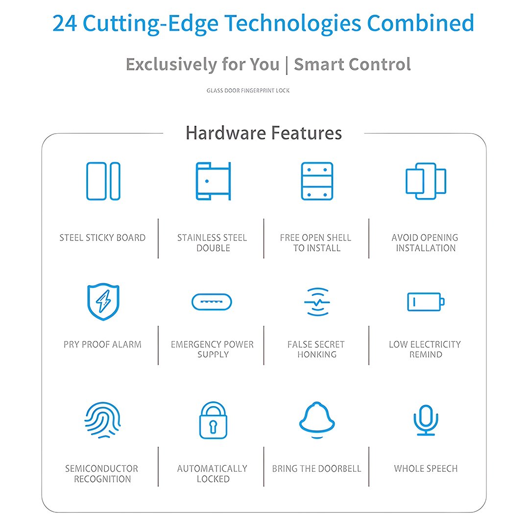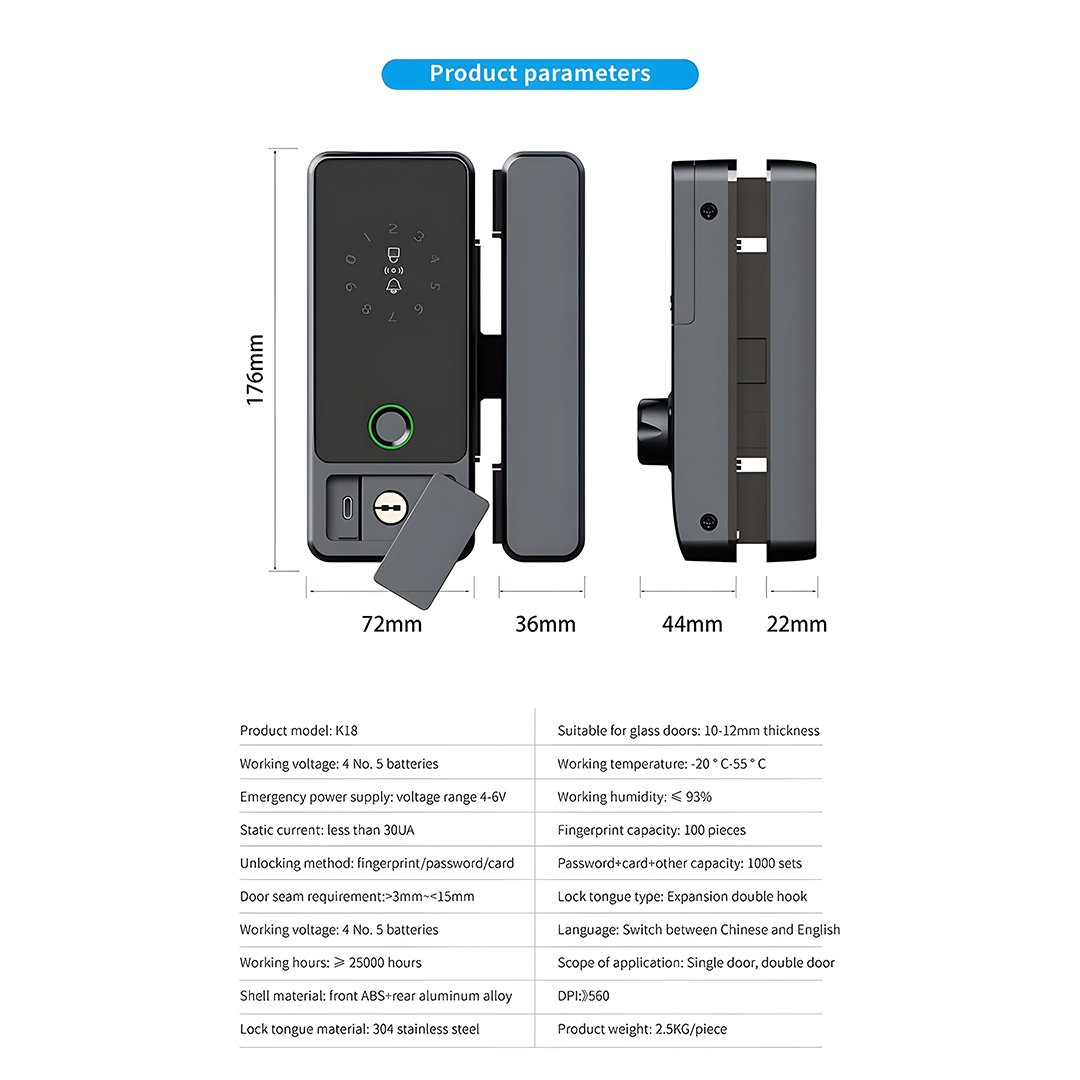 It is suitable for 10–12 mm glass doors as well as steel, aluminum, and wooden doors, making it versatile for multiple installations. The 304 stainless steel lock tongue offers enhanced durability and safety. Powered by 4 AA batteries, the lock is designed for long-lasting performance and can operate in extreme temperatures from −20 °C to 55 °C.