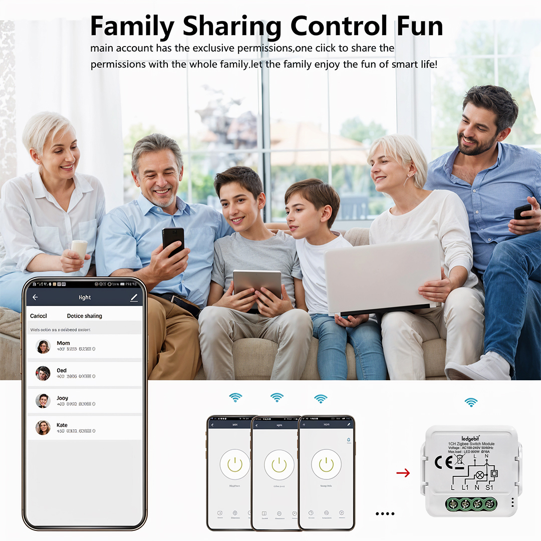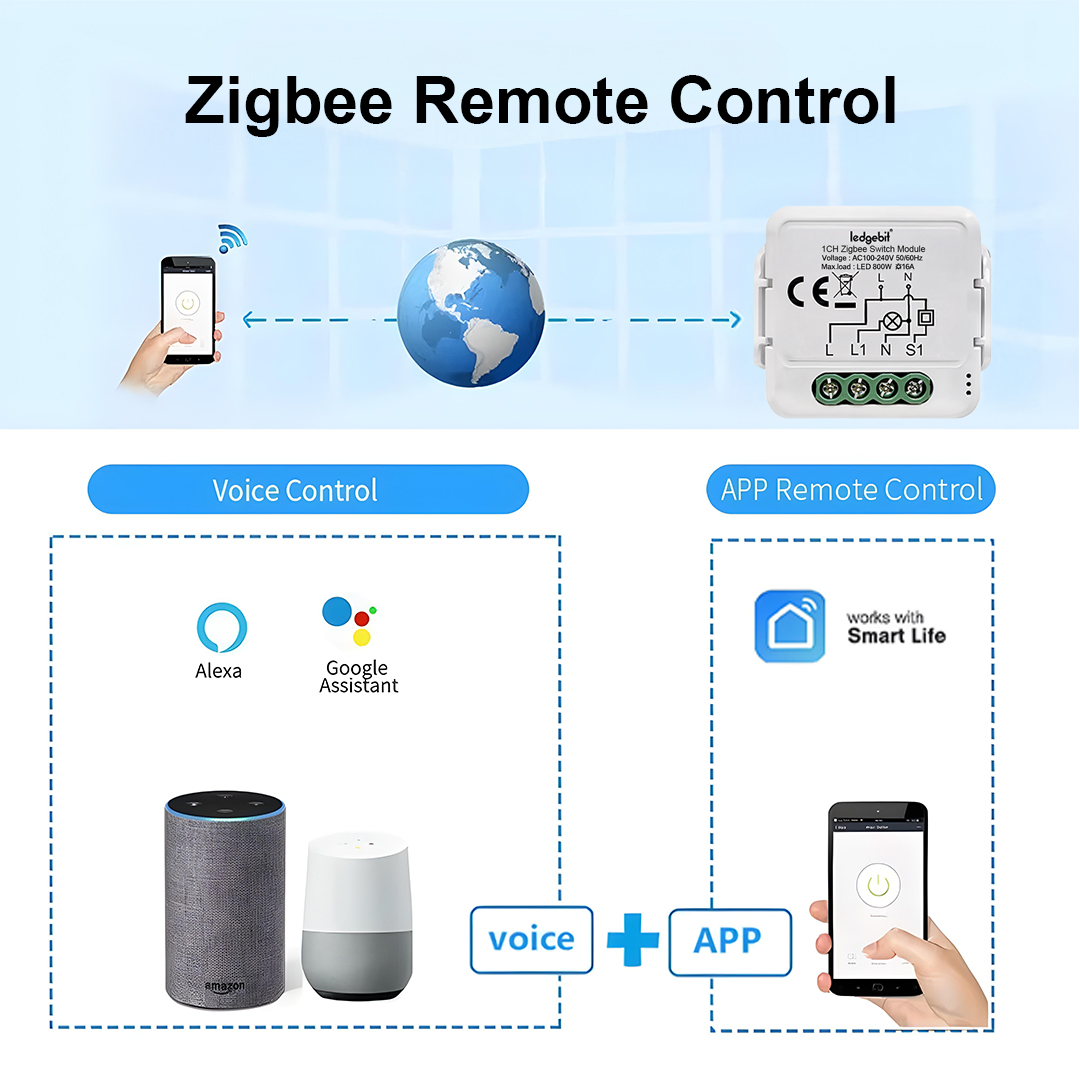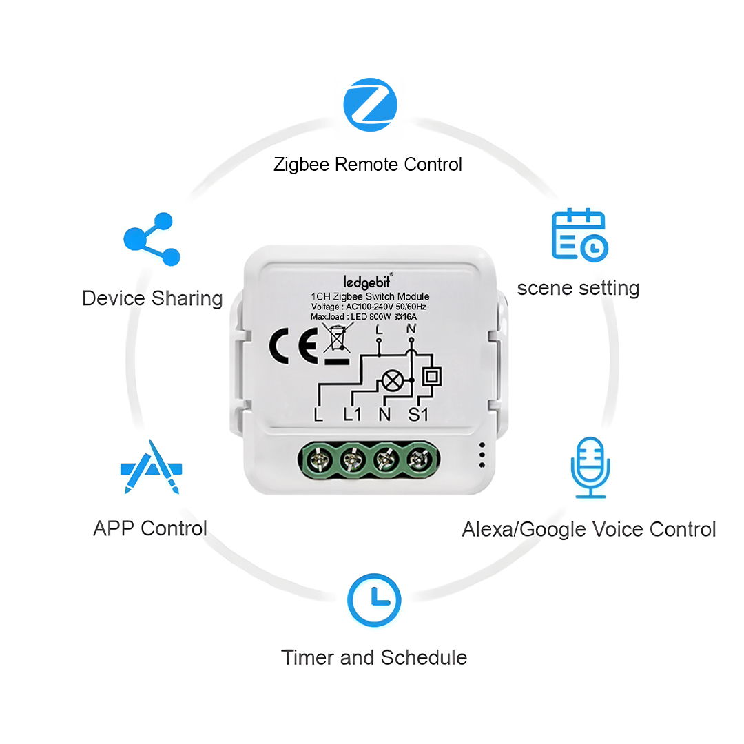 The Ledgebit Zigbee Smart Breaker One-Gang Module is a small but powerful device that lets you control up to four electrical circuits from your phone. Each channel supports up to 10A, making it perfect for lights, fans, or small appliances in your home or office.