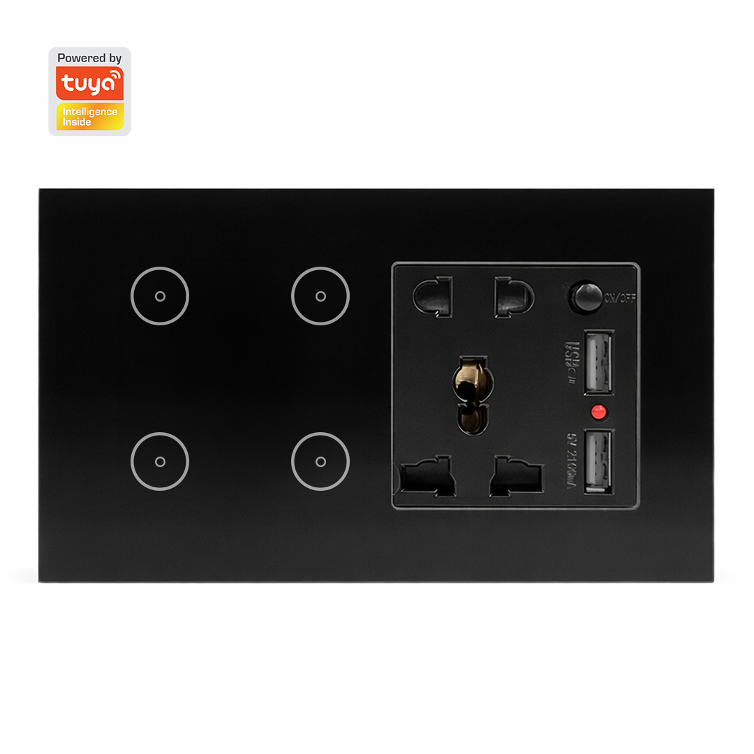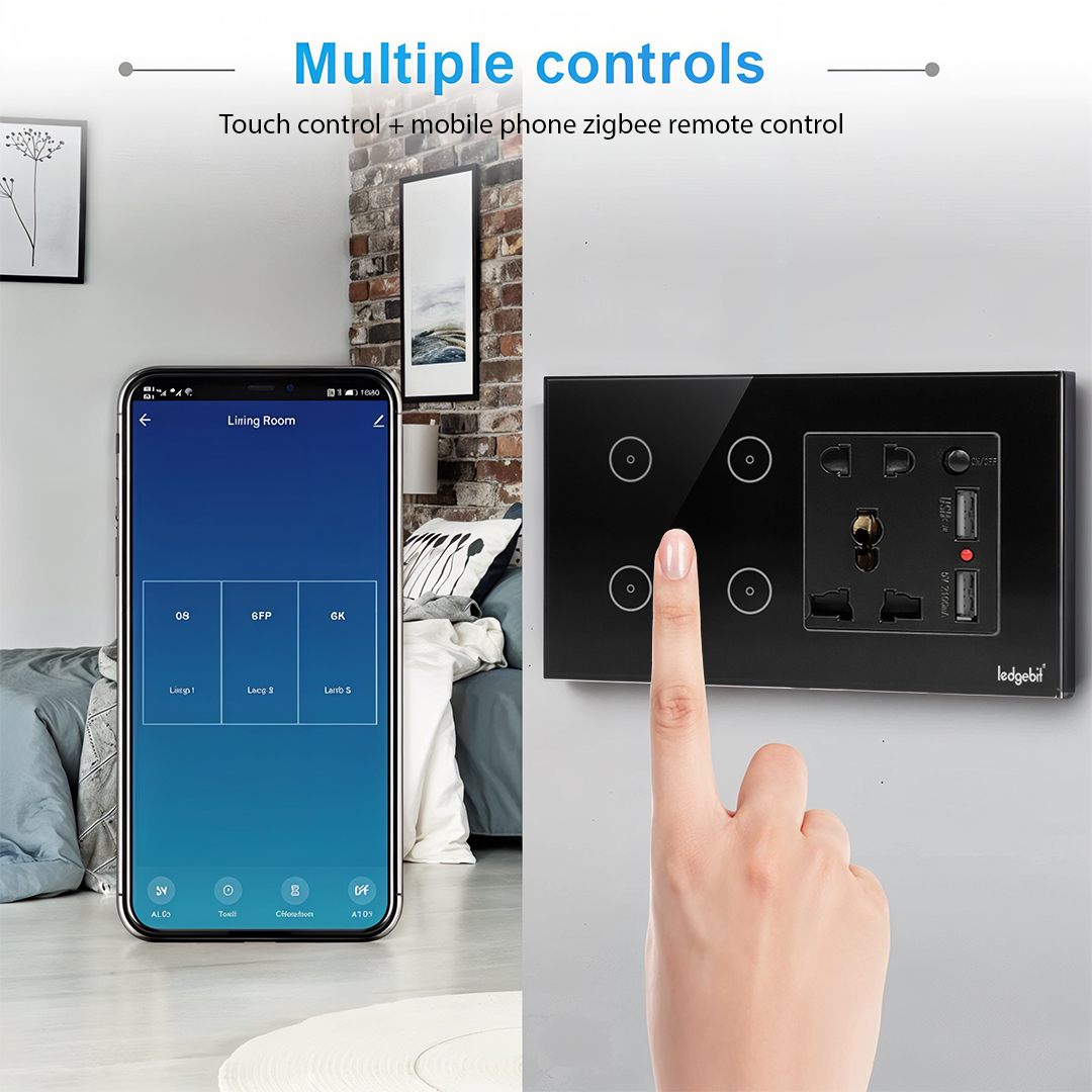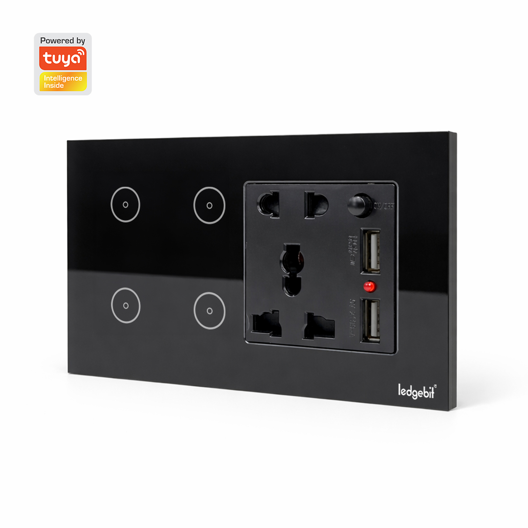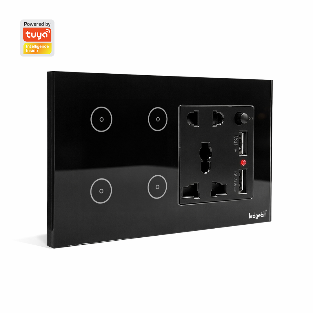 The Ledgebit 4 Button Smart Switch With Socket exemplifies advanced smart home technology, featuring a universal power outlet integrated with a tempered glass touch-sensitive panel for intuitive operation. This device facilitates seamless control of electrical appliances through capacitive touch inputs, while incorporating Zigbee protocol for reliable, low-power connectivity within smart home ecosystems. Requiring a compatible Zigbee Bridge-Hub, it enables remote management via the Tuya Smart Life application, including real-time power monitoring, scheduling, and energy consumption tracking to promote efficient usage.