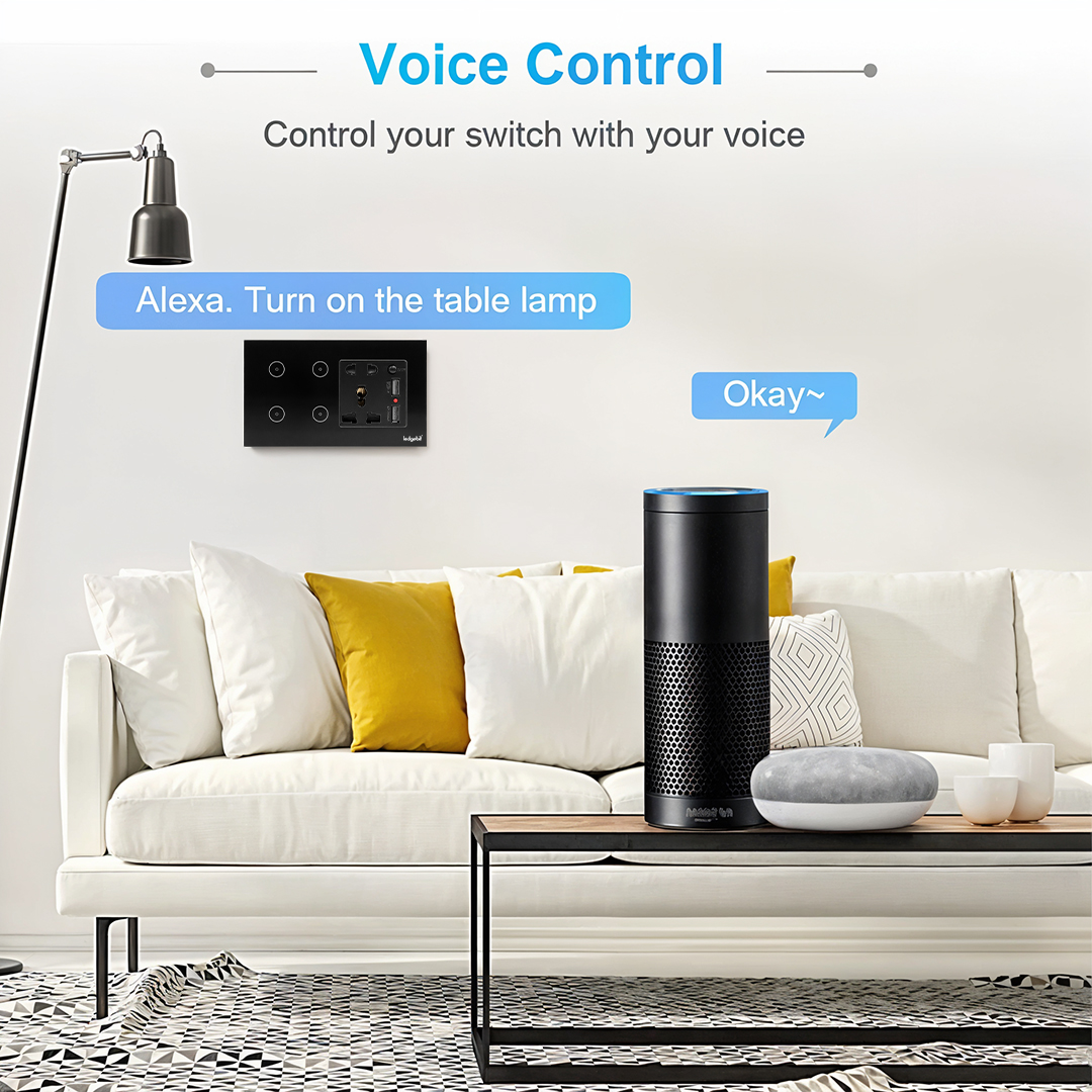 Constructed from flame-retardant PC and ABS materials combined with a durable tempered glass panel, the socket ensures safety and longevity, with an IP-rated design suitable for indoor environments such as bedrooms, kitchens, or offices. It supports universal plug compatibility and includes USB ports for fast charging, accommodating modern devices without additional adapters. Voice control integration with Amazon Alexa and Google Assistant allows for hands-free operation, enhancing accessibility for users.