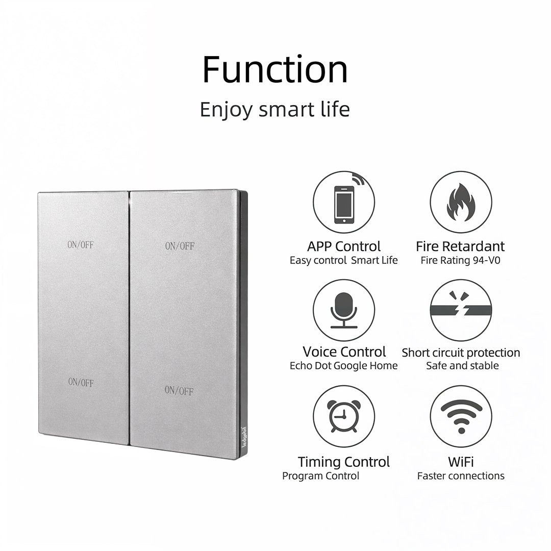 Constructed with fireproof PC materials and durable glass. With a mechanical life exceeding 500,000 cycles and it prioritizes reliability, energy efficiency, and safety. Installation requires a neutral wire and fits standard 86mm wall boxes, with support for wide voltage ranges to accommodate global electrical standards.