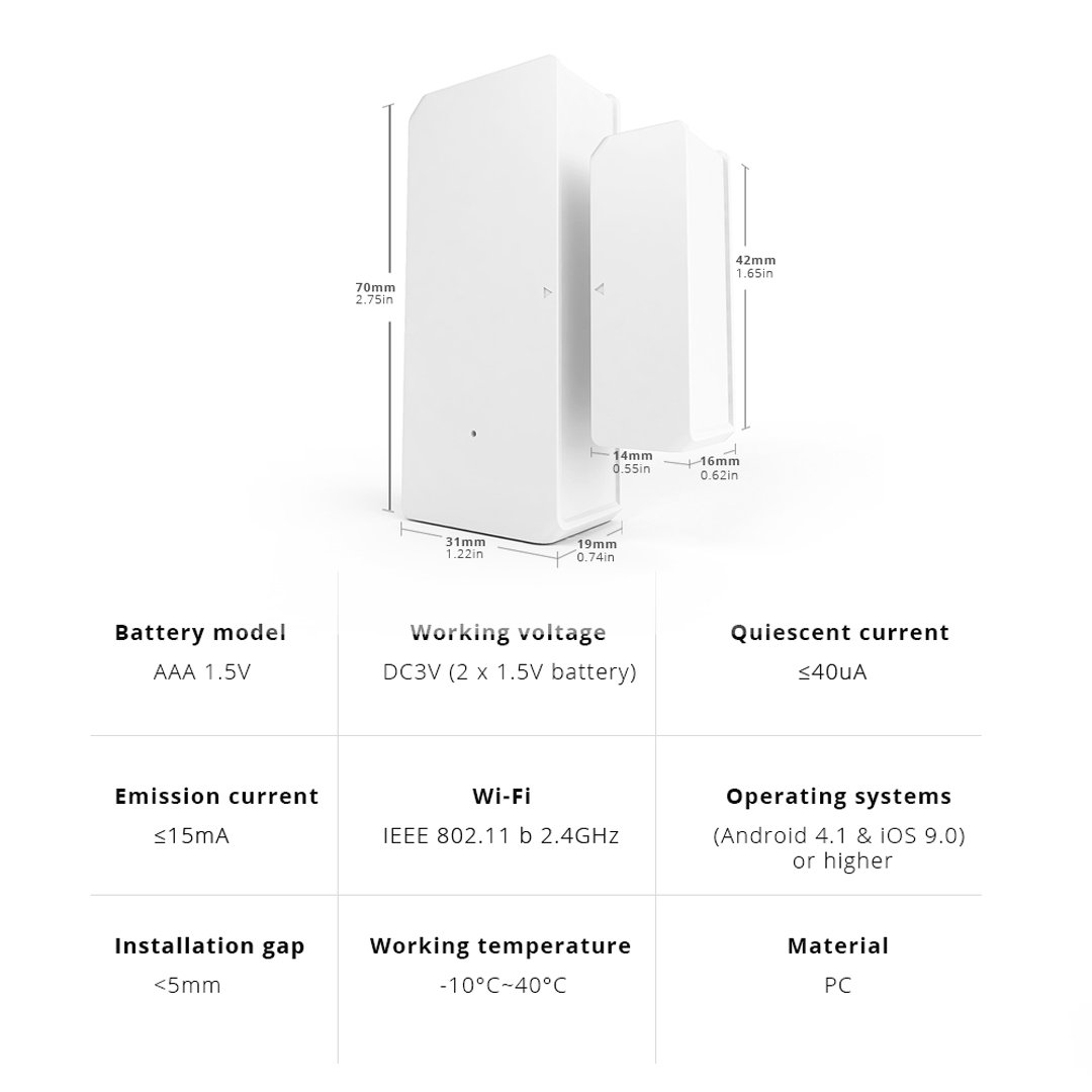 Installing the sensor is quick. Just insert two AAA batteries and stick both units onto a door or window frame. The sensor connects using 2.4 GHz Wi‑Fi and draws very little power, which helps the batteries last for months. When the battery gets low, the app will notify you in advance, so you never miss an alert.