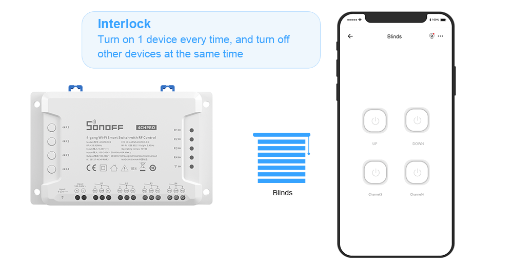 The 4CHPROR3 supports three control modes: interlock, inching, and self-locking. This lets you configure how each relay behaves depending on your needs. For example, you can use inching mode for momentary actions like garage doors or interlock for safety controls.