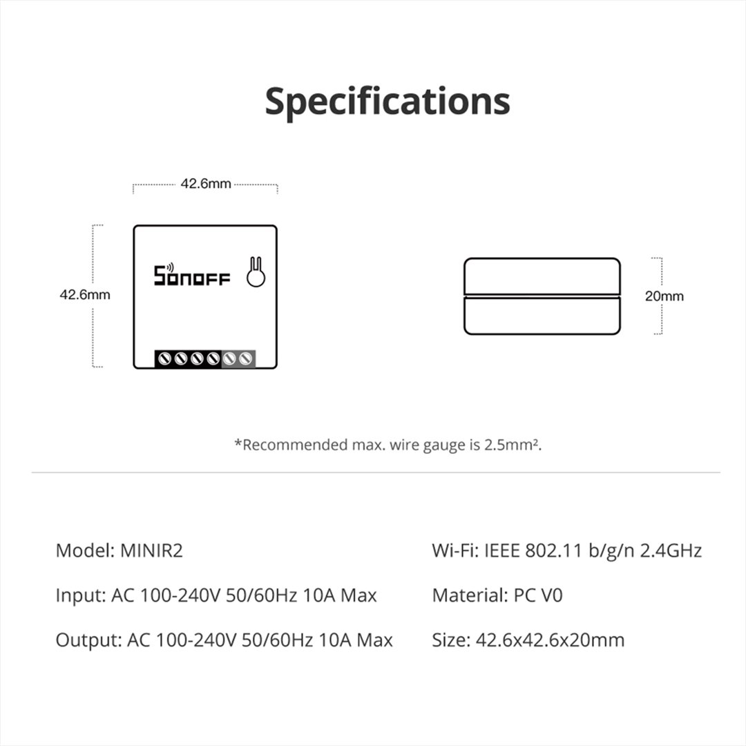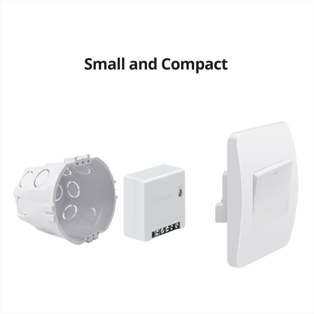 The Sonoff MINIR2 Smart Switch is a compact two-way Wi-Fi controller that upgrades your light circuits without changing your wall switch. It fits neatly behind standard switches and connects to your 2.4 GHz Wi‑Fi, giving you smart control through voice, app, or physical toggles.