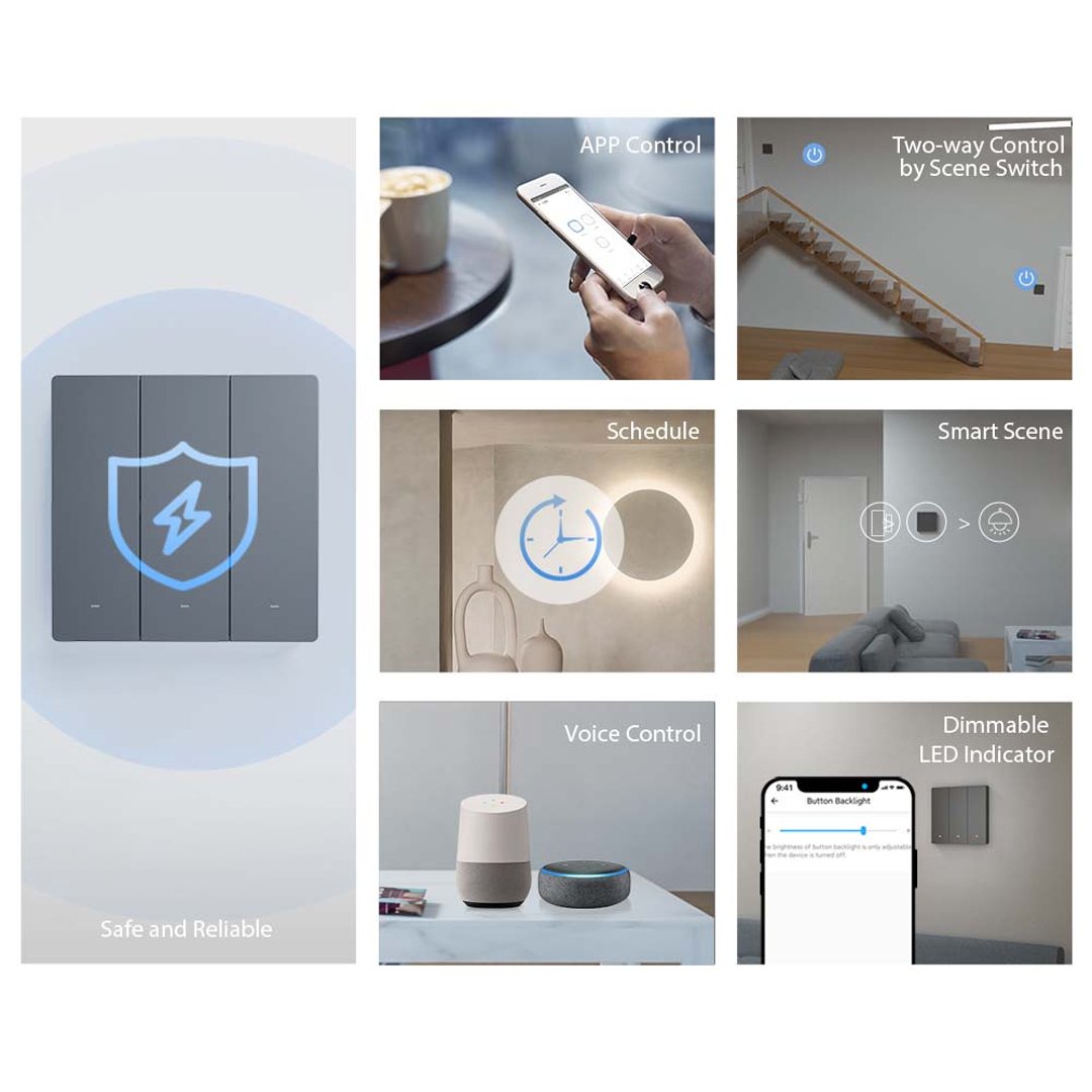 This 3-gang smart switch fits US-standard 120-size wall boxes and supports Amazon Alexa, Google Home, Smart Life, and eWeLink platforms. Whether you want to turn on a light, set schedules, or create scenes, you can control it from your phone or with voice commands.