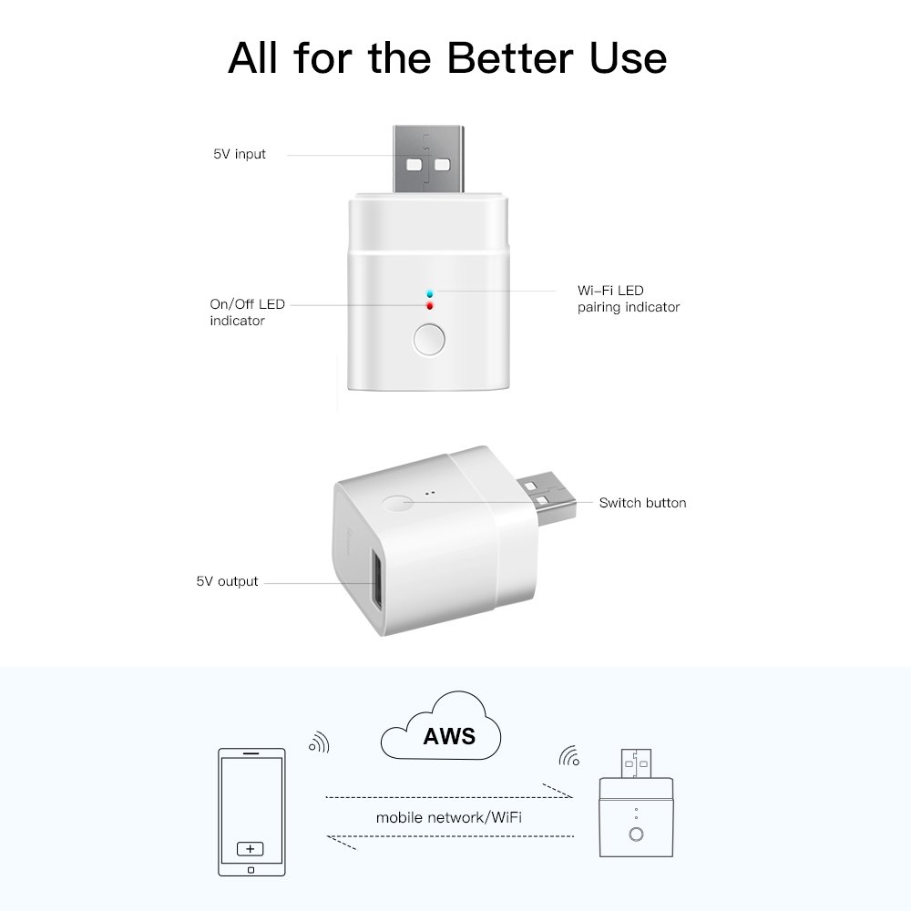 Transform your Type A USB devices into smart gadgets with the 5V Micro USB Smart WiFi adapter Smart Switch. This adapter is compatible with Alexa and Google Home and allows you to remotely control your devices via the eWeLink app, offering great convenience and energy-saving features.