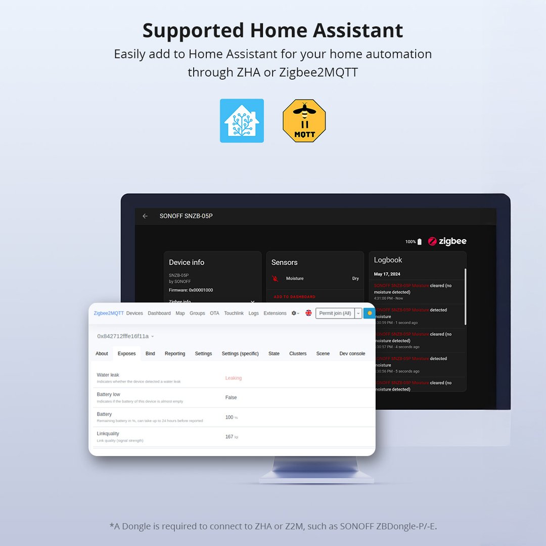 • Support Home Assistant: Easily integrates with Home Assistant via ZHA or Zigbee2MQTT. Requires a compatible Zigbee dongle, such as SONOFF ZBDongle-P or ZBDongle-E.