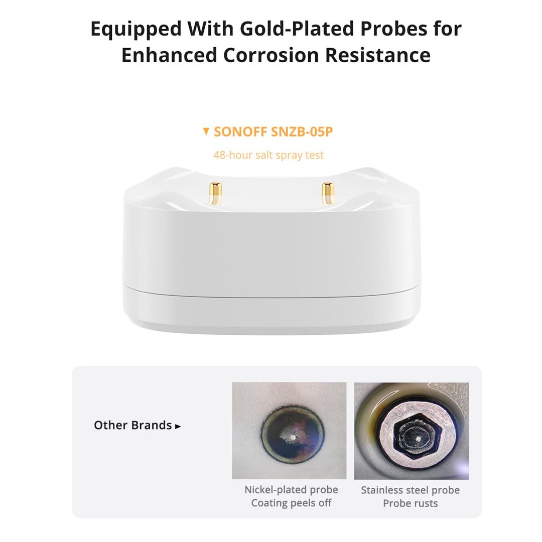 The sensor uses gold-plated probes for reliable detection. Its body is moisture- and dust-resistant, so it works well in damp environments. It also alerts you when the battery is low, making sure you’re always covered.